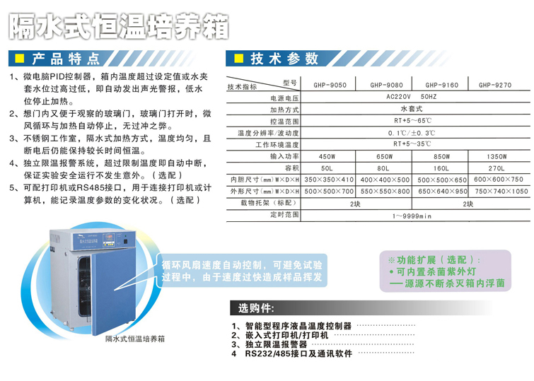 创新2013年培养箱操作规程,隔水式恒温培养箱技术文章产品描述 ·水夹套结构,采用双层玻璃门观察窗,玻璃门打开时,微风循环与加热自动停止,无过冲之弊。 ·微电脑PID控制器,箱内温度超过设定温度值或水夹套水位过高过低,即自动发出报警。 ·不锈钢工作室,隔水式加热方式,温度均匀,且断电后仍能保持较长时间恒温。