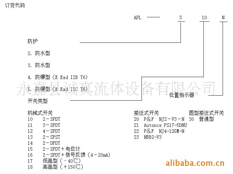 阀门限位开关(阀门回讯器、回信器)是自控阀门位置显示和信号反馈的一种现场仪表,用以将阀门的开启或关闭位置以开关量(触点)的信号输出,被程控接受或计算机访样,确认后执行下一程序。该产品外观优美、机构紧凑、质量可靠、输出性能稳定、免维护等特点。公司拥有:ALS(APL)-210经济紧凑型机械式;ALS(APL)-220经济型感应式P+F等Eexia本安型;ALS(APL)-310坚固机械型,ALS(APL)-320坚固感应型(P&F,IFM等);ALS(APL)-330自带4~20mA阀位信号反馈型;ALS10原装进口型机械式,ITS-100原装进口机械开关,ALS(APL)410,ITS300BT6防爆型机械式开关;420防爆感应式开关(P+F,IFM,欧姆龙OMRON,GOSWICH,国产等),430防爆智能型的(内置电流反馈式);ALS(APL)-510BT6防爆方形机械式;520防爆接近式开关;530防爆内置4~20毫安电流反馈型等系列产品。公司拥有多项专利设计权利。