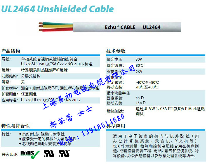 应用标准 : UL758,UL1581及CSA C22.2 No.210.2