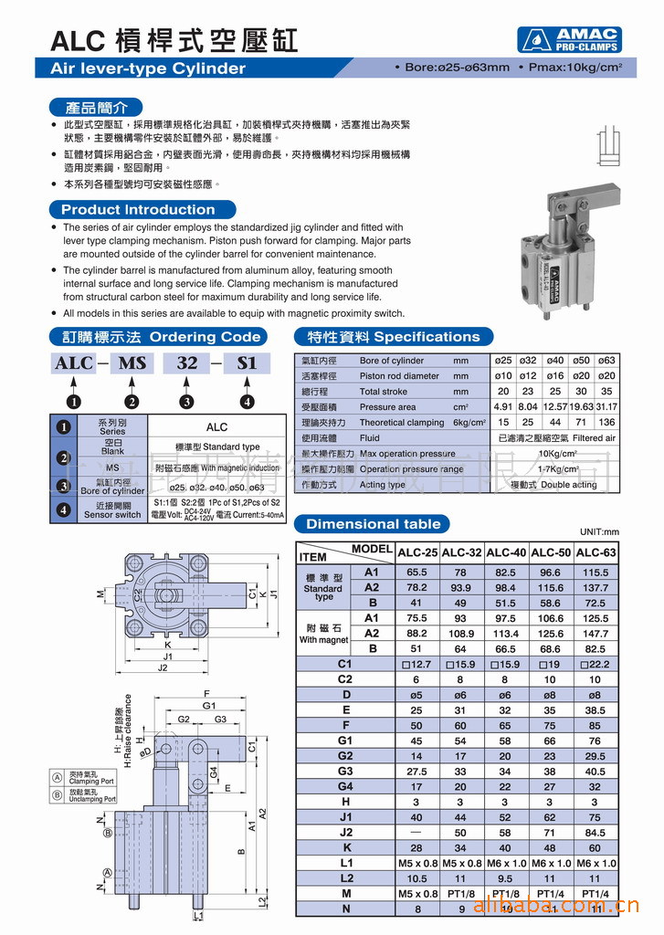此型式空壓缸,採用標準規格化治具缸,加裝槓桿式夾持機構,活塞推出為夾緊狀態,主要機構零件安裝於缸體外部,易於維護。