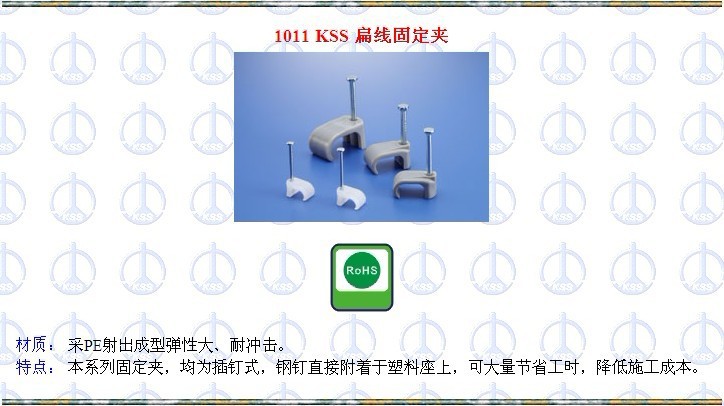 我司是专营KSS的配线器材目前产品有几万种[如;扎带、配线槽、浪管、固定头等]行销世界百于国,是亚洲最大的专业配线器材配套商,在电力、电子、机械、家具等工业领域深受信赖,现在阿里巴巴推出我们的形象产品KSS 固定夹系列,可为企业提供专业的产品配套,可为经销行业人士提供产品批发,我们以品质为保证,以服务求发展,期待与您的合作。