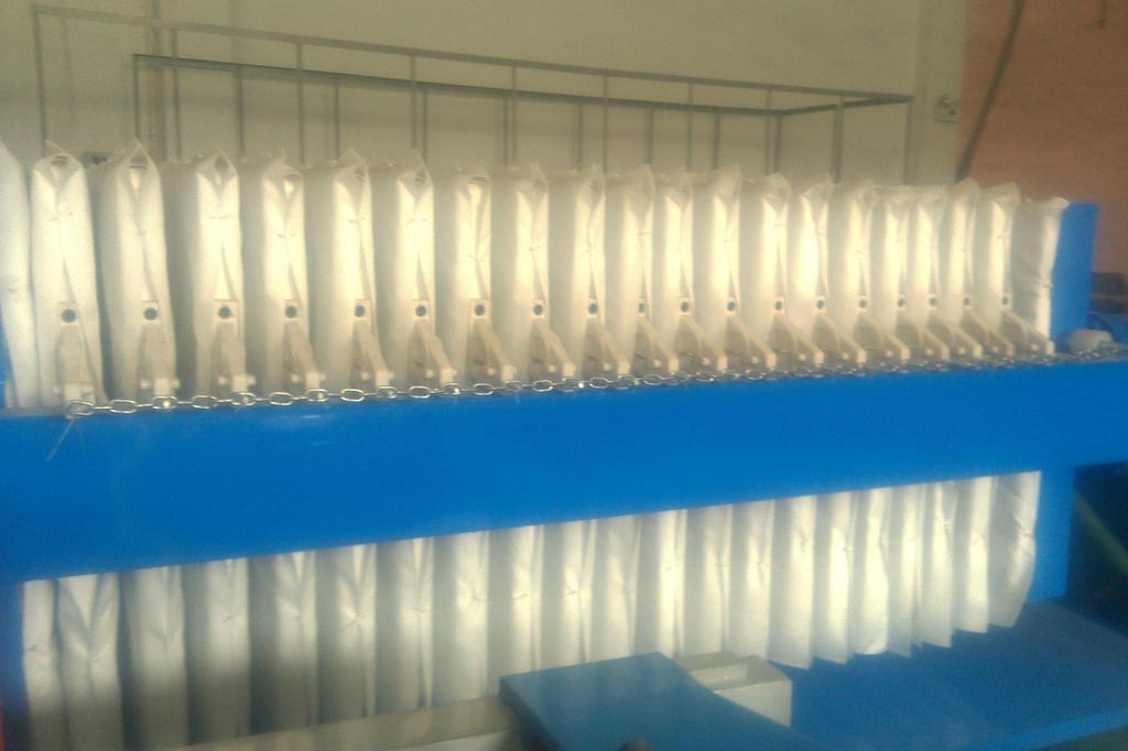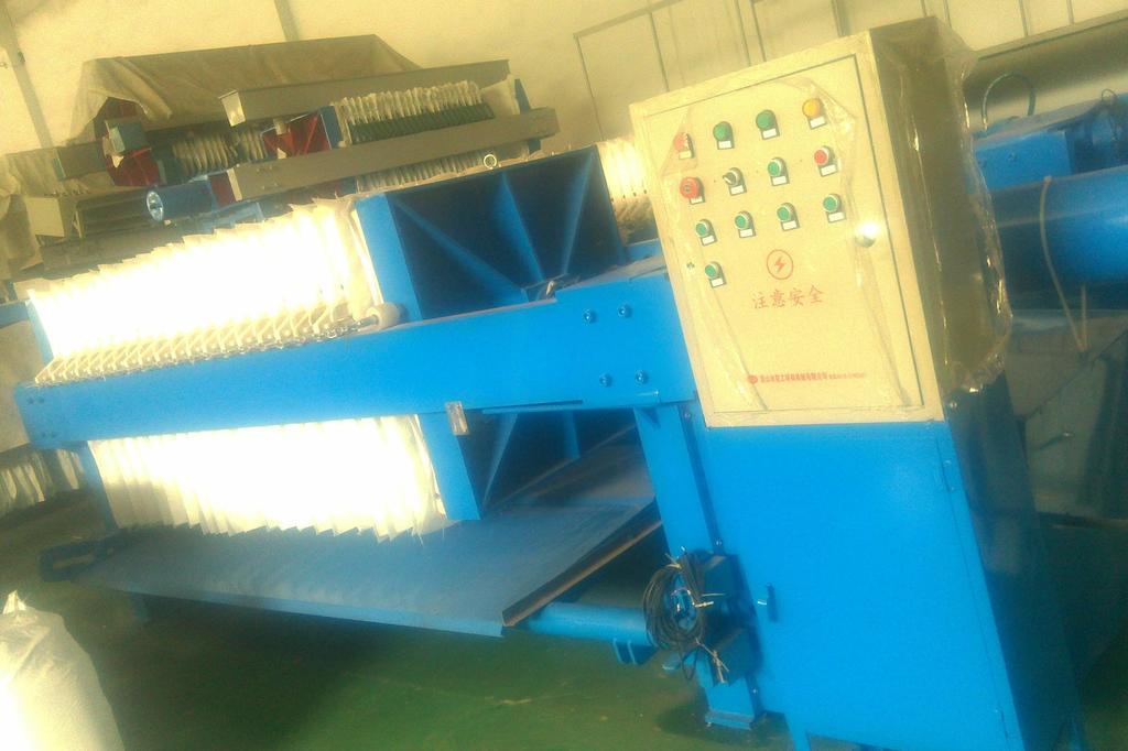 隔膜压滤机是由隔膜滤板(隔膜滤板是由两片聚丙烯膜片与高强度聚丙烯芯板热融合成)和厢式滤板排列组成虑室,在输料泵的作用下,将料将输入虑室,通过滤布将料将中的固体和液体分离,当料浆中的固体形成饼后,在向隔膜通入压缩空气,对虑室内的固体充分压榨,将低含水率。尤其对粘性物料的过滤及含水率要求高的用户,此机更有独特的特性。采用低起动变频减速机自动拉板,PLC程序控制、省时省力、操作简单、性能稳定