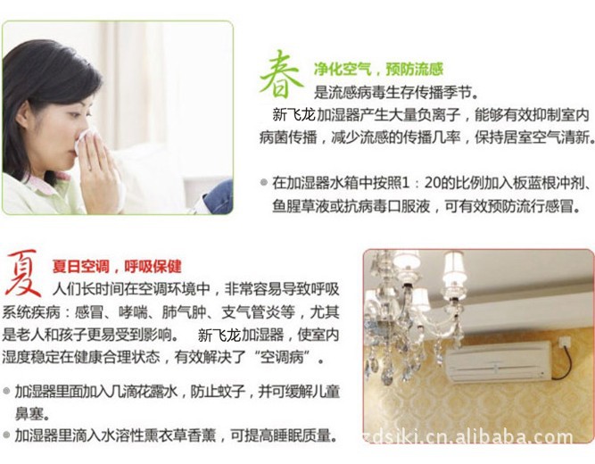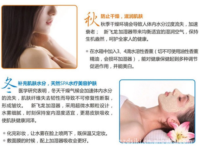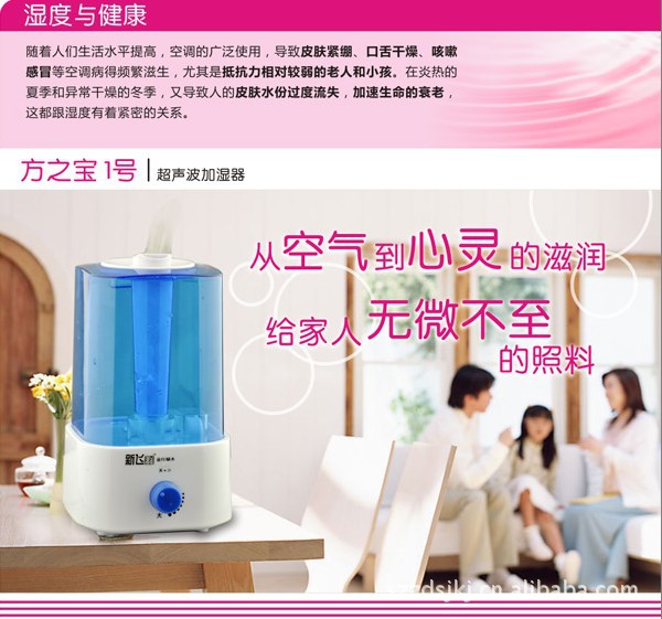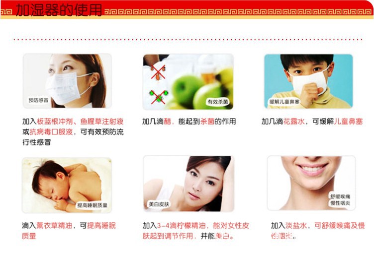 我国夏天炎热需要开空调,秋冬季及北方四季气候干燥,多风沙与干燥天气,自然气候、开空调、通暖气都会造成人体肌肤水份大量流失,加湿器可使室内空气湿润、清新。良好的空气湿度使干燥的皮肤毛孔舒张,水嫩透白,从而达到美容效果。是送给女性朋友的最好礼物。良好的空气湿度减少空气的漂浮物(如尘埃、毛发等)的产生,防止静电。居家自用送礼二相宜。湿润的空气对慢性气管炎,支气管炎,流行性感冒等疾病都有明显的辅助疗效,也是孝敬老人的绝佳礼: