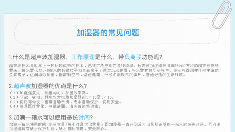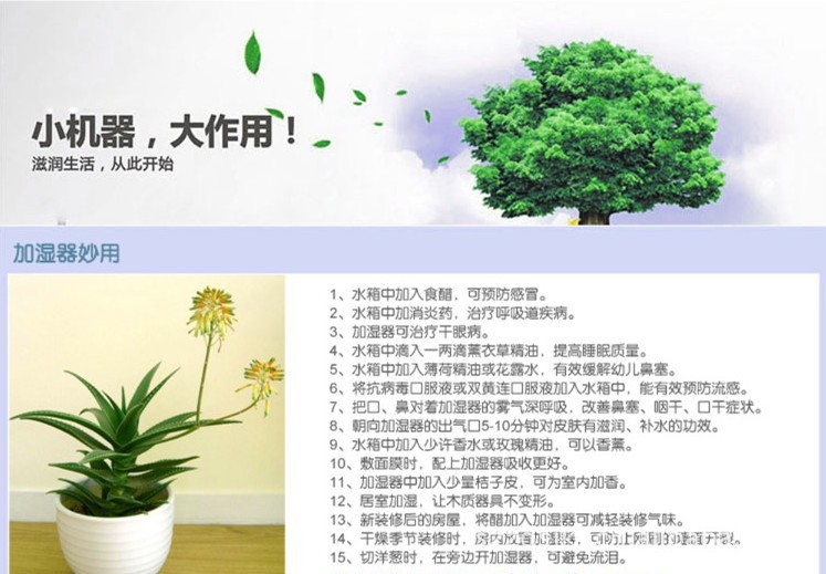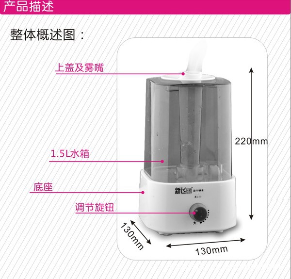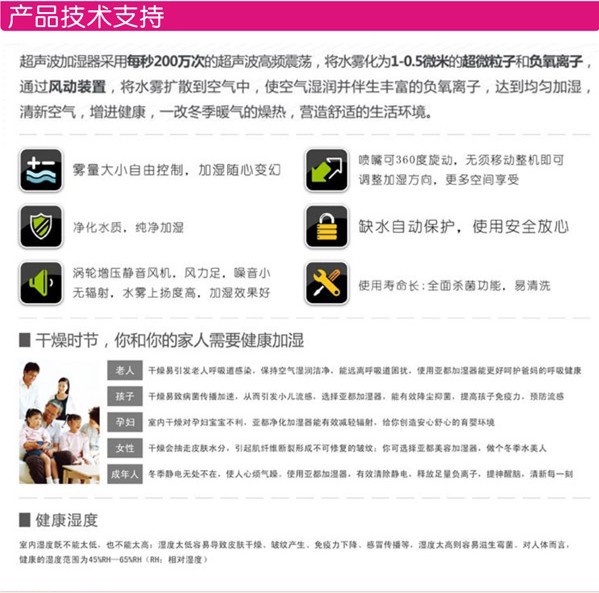 随着人们生活水平提高,空调广泛使用,导致皮肤紧绷口舌干燥、咳嗽感冒等空调病的滋生。本产品在雾化过程中,释放大量负氧离子,能有效增加室内湿度,滋润干燥空气,并与空气中漂浮的烟雾、粉尘结合使其沉淀,能有效除去油漆味、霉味、烟味及臭味,使空气更加清新,保障您和家人的健康。