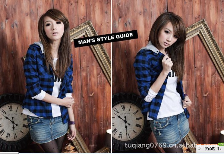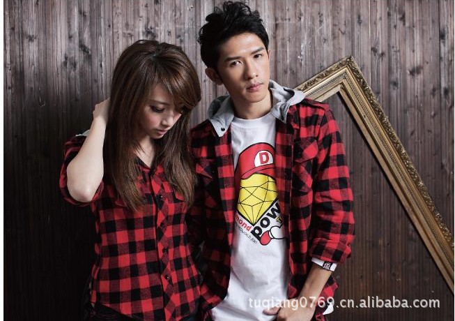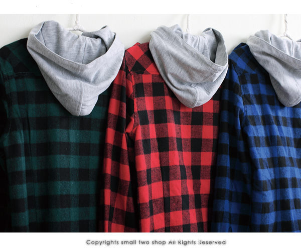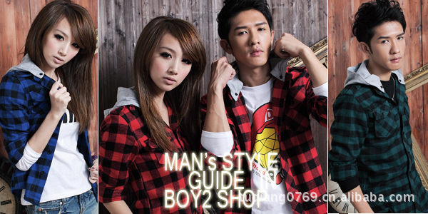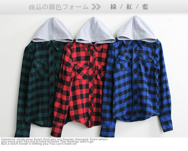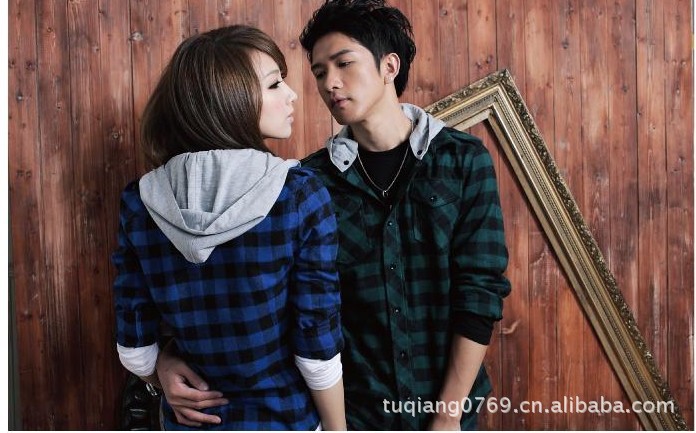 潮流韩版 纯棉情侶衬衣 帽可折 大格紋連帽休闲男女款 班服