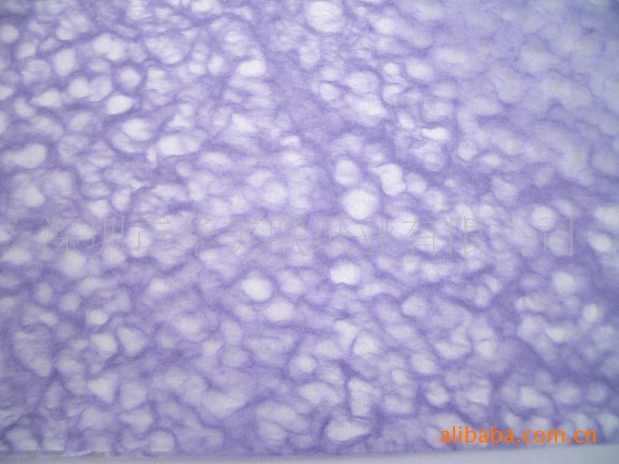 利用中国古老的传统工艺,采用植物纤维,纸桨中加入进口颜料进行调色,经过手工捞制而成,具有韧性强,无酸性,环保性,色泽纯正,明快艳丽,不褪色。纸张肌理天然偶成,多姿多彩,极富东方神韵,又不失现代美感。