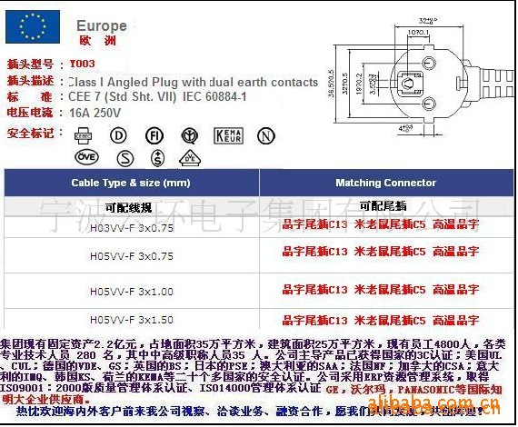三.公司和证书介绍 宁波云环电子集团有限公司专业生产世界各国标准电源线,插头,插 座,橡胶线,连接线,线束,编织线等。我们的产品已经通过UL,CSA,VDE,CE,PSE, KEMA,IRAM,SAA,BS,KETI,KS,,D,GS,CEBEC,DEMKO,NF等多国的认证, 已及ISO9001-2000质量认证体系。公司的产品畅销欧洲,美洲,澳洲,中东,南非, 亚洲等海外市场;本公司产品符合欧美环保标准,产品价廉物美,质量可靠;本公司 提供OEM,ODM服务,目前拥有一大批稳定的海内外客户,产品90%以上出口,为 许多世界知名企业的冰箱,冷柜,空调,烤炉,洗衣机,厨房设备等各种家电提供高 品质的插头插座和线束。
