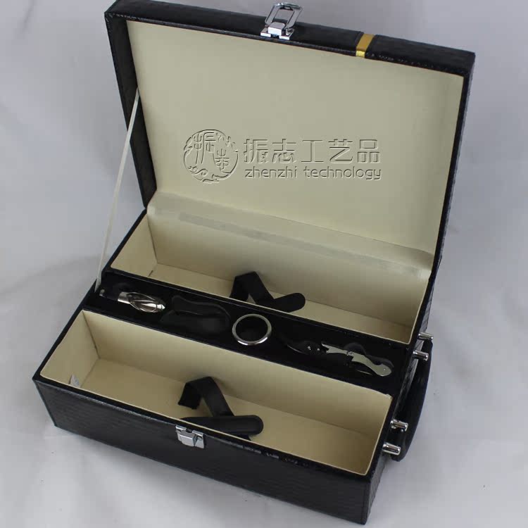 盒子外径:约34.5x25.5x12.5cm(不含提手和锁扣)盒子内径:长度约33.5CM 宽度约8.5*2CM高度约:8.5CM适用范围:标准750ML红酒瓶