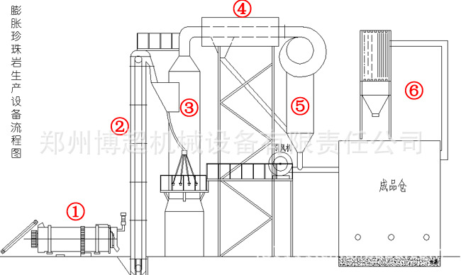 原砂—预热炉—斗式提升机—珍珠岩膨胀炉—水冷系统—蜗牛式分离器—风送系统—称量包装—除尘系统