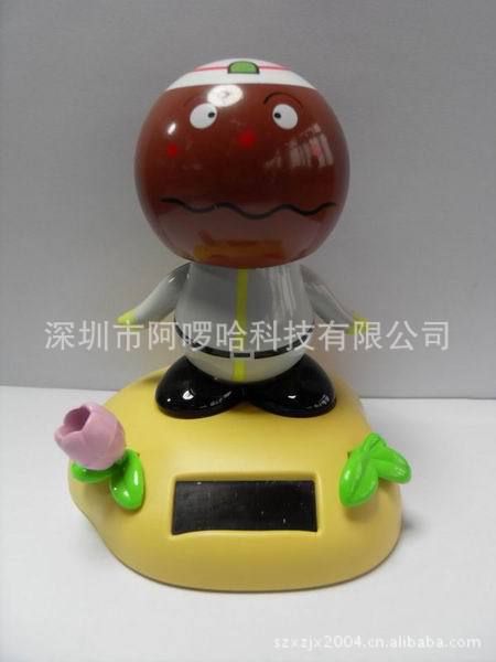【产品介绍】 太阳能摇头娃娃(太阳能公仔)主要以太阳能为食粮,不需任何动力原料。公仔座前设有阳光接收口,即IC接口,采光度强,适合室内摆设。太阳能公仔头部为活动设计,IC口将所采集到的阳光转换成为太阳能,在太阳能的作用下,可爱的太阳能公仔频频向您摇头微笑,趣味十足,在它的影响下您的心情也如阳光般清朗。 它是您室内以及办公桌不可缺少的装饰,也可作为车载配饰,为你的爱车增添独一无二的活力与气质。
