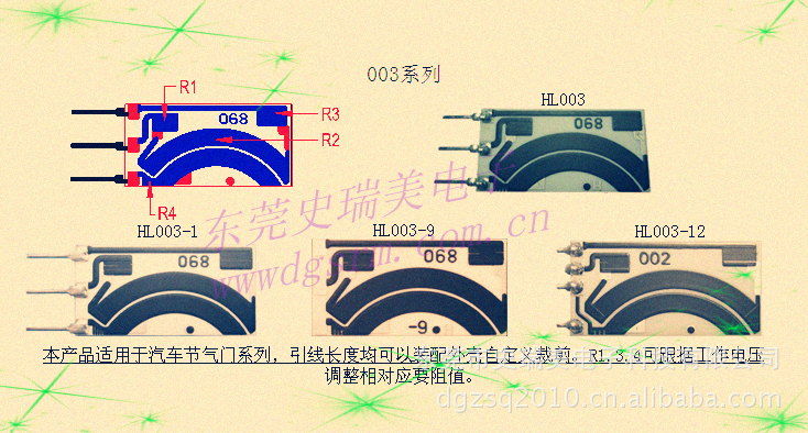 厂家直销汽车节气门位置传感器-003系列电阻片,质量保证,价格优惠,可根据客户要求尺寸订造产品! DHMY系列厚膜电阻板是本公司专门为电喷型汽车发动机节气门位置传感器设计的厚膜电路板。该产品采用丝网印刷、高温烧结、激光调阻等先进的厚膜工艺加工而成,产品在燃油、润滑油及盐化雾等工业环境下的耐腐蚀能力强,输出线性特性曲线好、抗磨性能强,使用寿命长,可用于德国BOSCH系统和美国DELPHI系统的节气门位置传感器。