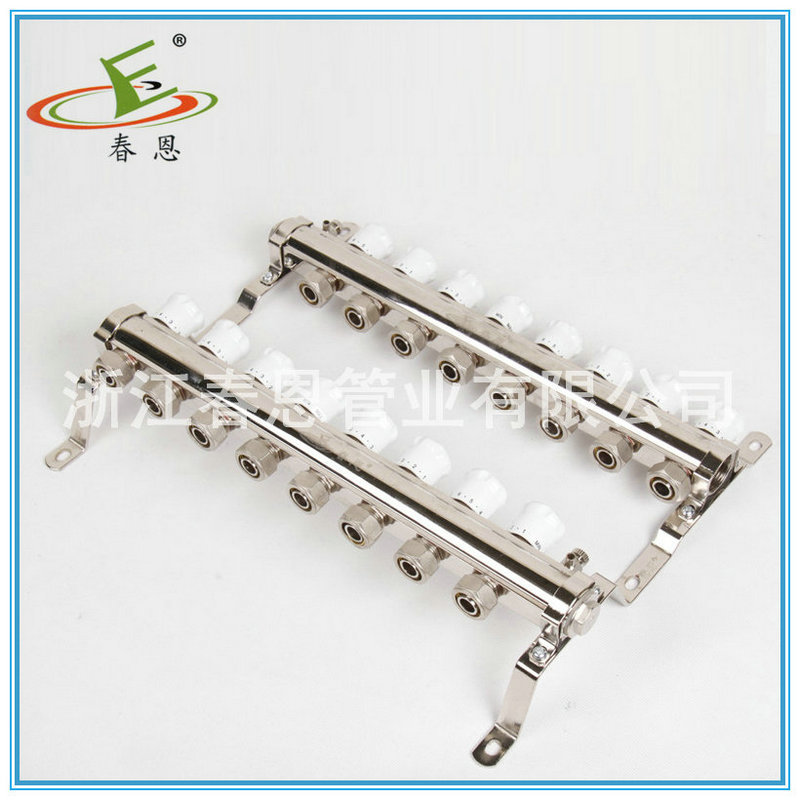 分、集水器(manifold)是水系统中,用于连接各路加热管供、回水的配、集水装置。按进回水分为分水器,集水器。所以称为分集水器或集分水器, 俗称分水器。地暖、空调系统中用的分水器材质宜为黄铜、自来水供水系统 户表改造用的分水器多为PP或PE材质。 供回水均设排气阀,很多分水器供回水还设有泄水阀。 供水前端应设“Y”型过滤器。 供水分水管各支管均应设阀门,以调节水量的大小。分水器常用于:1. 地板采暖系统中的,分集水器管理若干的支路管道,并在其上面安装有排气阀,自动恒温阀等,一般为铜质较多。口径小,多位DN25-DN40之间。进口产品较多。2. 空调水系统,或其它的工业水系统中的,同样管理若干的支路管道,分别包括回水支路和供水支路,但其较大多位DN350-DN1500不等,用钢板制作,属于压力容器类专业制造公司,其需要安装压力表温度计,自动排气阀,安全阀,放空阀等,2个容器之间需要安装压力调节阀,且需要有自动旁通管路辅助。3.自来水供水系统,分水器的使用有效的避免了自来水管理方面的漏洞,集中安装、管理水表,并且配合单管多路使用降低了管材采购成本,而且极大的降低了施工时间,提高了效率。自来水分水器通过异径直接连接于铝塑主管道,在水表池(水表房)中集中安装水表,做到一户一表,户外安装、户外查看。目前全国各地户表改造正在大范围进行中。