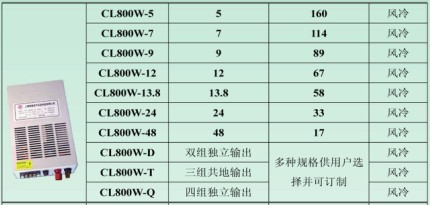 CL800W-5 DC输出电压5V,DC输出电流160A,风冷 CL800W-7 DC输出电压7V,DC输出电流114A,风冷 CL800W-9 DC输出电压9V,DC输出电流89A,风冷 CL800W-12 DC输出电压12V,DC输出电流67A,风冷 CL800W-13.8 DC输出电压13.8V,DC输出电流58A,风冷 CL800W-24 DC输出电压24V,DC输出电流33A,风冷 CL800W-48 DC输出电压48V,DC输出电流17A,风冷 CL800W-D DC输出电压——双组独立输出,DC输出电流——多种规格选择并可订制,风冷 CL800W-T DC输出电压——三组共地输出,DC输出电流——多种规格选择并可订制,风冷 CL800W-Q DC输出电压——四组独立输出,DC输出电流——多种规格选择并可订制,风冷
