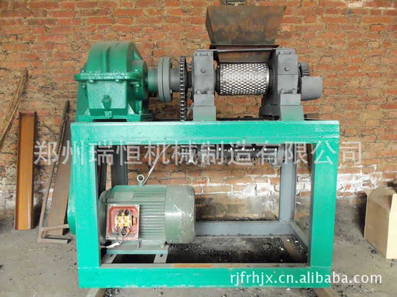该系列对辊式造粒属挤出滑模型,其工作原理是由电动机驱动皮带和皮带轮,通过减速机传递给主动轴,并通过对开式齿轮与被动轴同步,相向工作。物料从进料斗加入,经过辊挤压成型,脱模造球,并经过一副链条,传送到破碎筛工作室,筛下和分离成品颗(球)粒,然后返回料与新料混合,再进行造粒。随着电动机连续转动,物料的不断进入,方能实现批量生产。