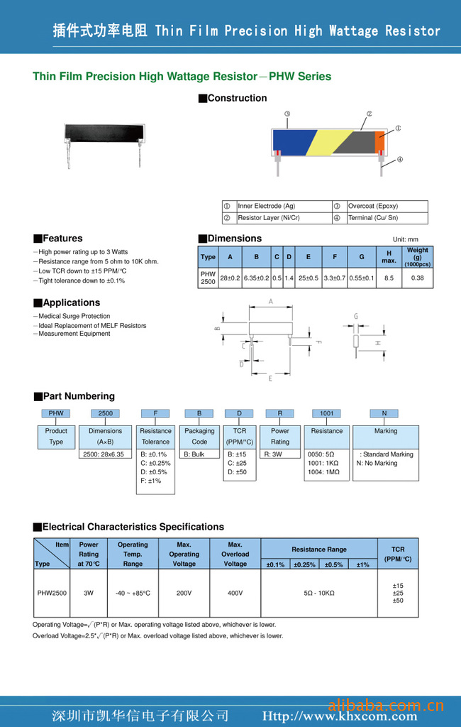 凯华信电子专业生产PHW 2500插件式功率电阻