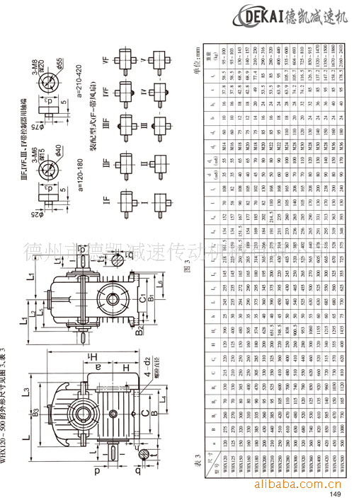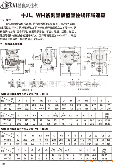 德州德凯减速传动机械有限公司生产圆弧齿圆柱蜗杆减速机,符合部颁标准(JB2318-79),包括WHT(通用型)、WHX(蜗杆在蜗轮之下)WHS(蜗杆在蜗轮之上)和WHC(蜗杆在蜗轮之则)四个系列,主要广泛适用于冶金、矿山、超重、运输、石油、化工、建筑等机械设备的减速机传动。工作条件:蜗杆输入转速不超过1500r/min;蜗杆轴可正、反向运转;工作环境温度0℃——40℃。当环境浊温度低于0度时,启动前润滑油必须加热到0度以上。或采用低凝固点的润滑油;高于40度,必须采取冷却措施。