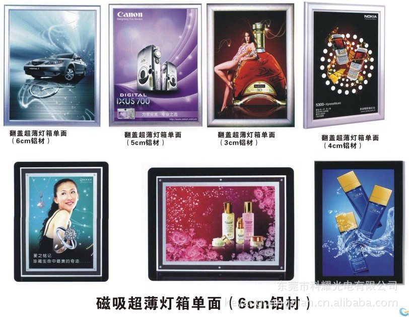 - 产品特点:透明水晶边框,特超薄(外观厚度仅8mm-16mm)使用LED光源,安全节能,寿命长达5-10年,比传统的灯箱省电达70%以上。并且环保,轻巧,安装简便,更换图片快捷,省时省力,及可按照客户要求定制特殊尺寸等诸多优点。