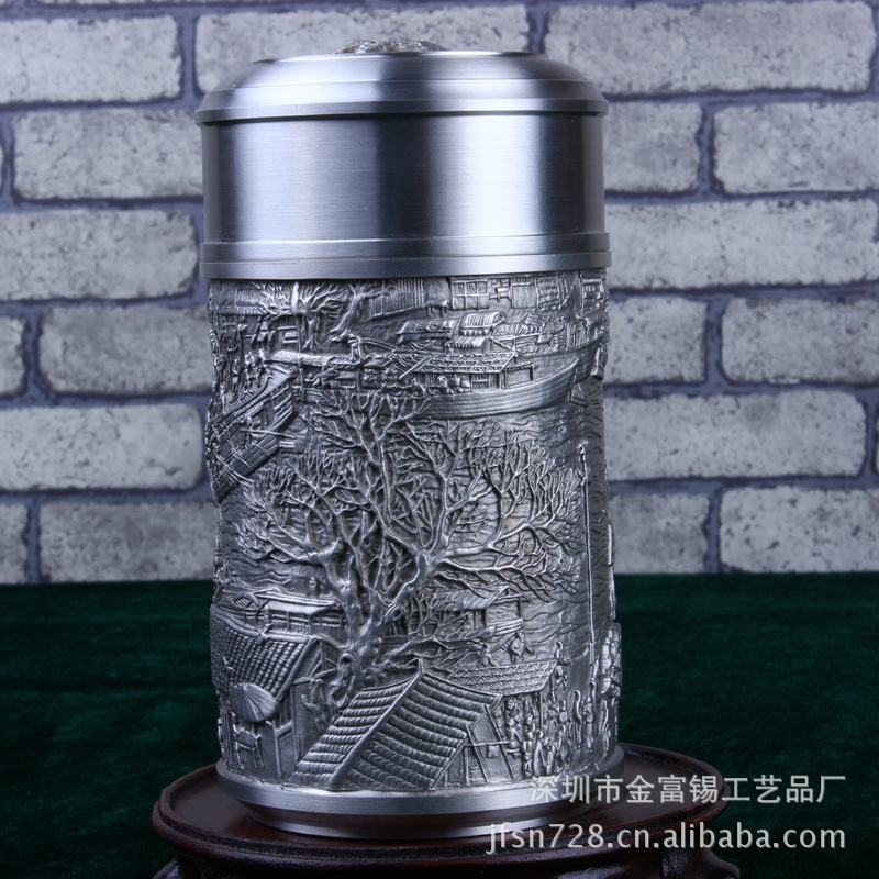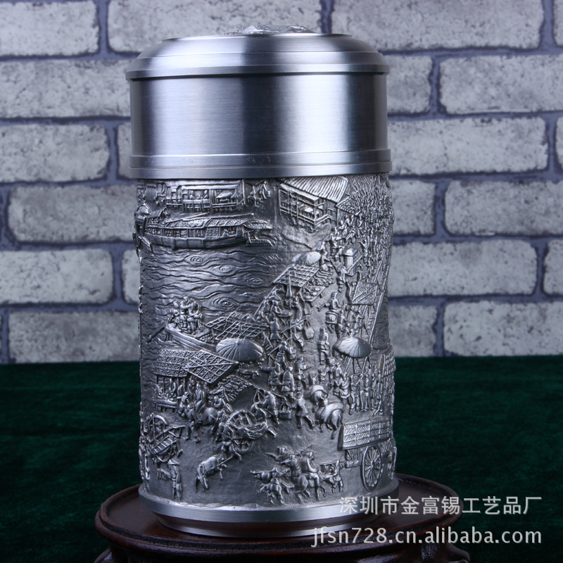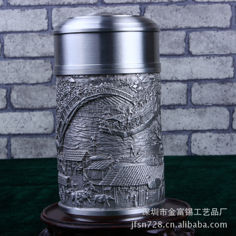 •产品卖点:此款茶罐非常具有中国文化韵味,感觉厚重,满足了高端人士精神文化层次的需求,做工精细,手工雕模而成,更能说明锡材质延展性好,适合雕刻图案的特点,取材清明上河图的寓意更是商业送礼和庆典纪念的最佳选择。