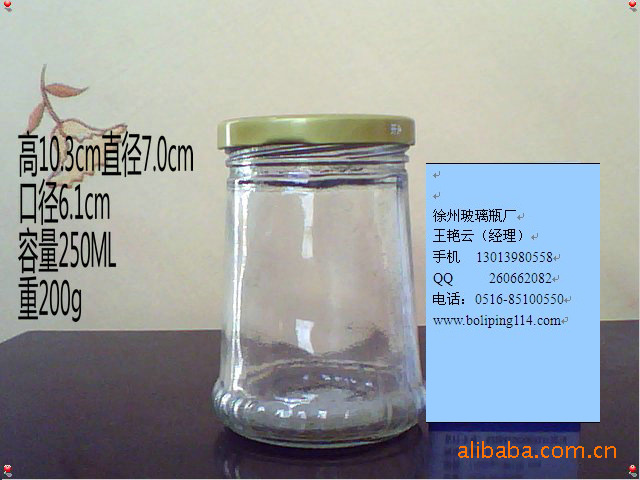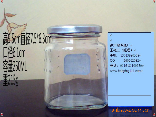 本厂生产各种高白料,普白料,青白料玻璃瓶,品种主要有:蜂蜜瓶、果酱瓶、酱菜瓶、酱油瓶、醋瓶、麻油瓶、酒瓶、饮料瓶、罐头瓶、腐乳瓶、调味瓶、果酒瓶、保健酒瓶、果汁瓶、医药瓶、咖啡瓶、玻璃口杯、玻璃奶瓶、玻璃烛台、玻璃把子杯、玻璃水杯、玻璃口服液瓶、果茶瓶、料酒瓶、番茄酱瓶、米酒瓶等。