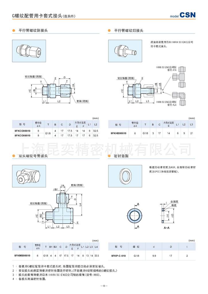 ①平行管螺纹阴/阳接头:8FKCO06010,8FKCO08010,8FKCO08020,8FKCO10020,8FKHB06010,8FKHB08020,8FKHB10020.