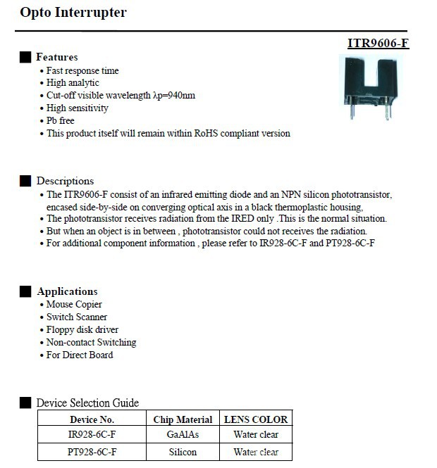 超毅电子代理的光电开关ITR9606-F具有反应时间快,高分辨率,可以阻挡940nm的可见波长,灵敏度高,无铅,产品符合RoHS标准等特点。它可以应用在复印机,扫描仪开关,硬盘驱动器,非接触式开关,看板等产品上。