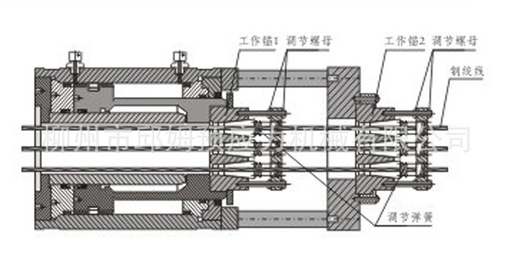 3、单顶双顶压三工具锚结构:即一台穿心式千斤顶配套两台顶压器和三套工具,其中两顶压器的活塞杆上均有一套工具锚组件,重物的提升像预应力钢筋张拉过程一样,上、下主千斤顶活塞依次往复伸缩运动,依靠上、下工具锚组件的协调动作,交替夹紧,使重物连续提起。上、下工具锚组件均由上、下顶压器调节工具锚组件的预紧和松锚,避免出现因工具夹片跟进不齐而不能锁紧或受力不均的现象。