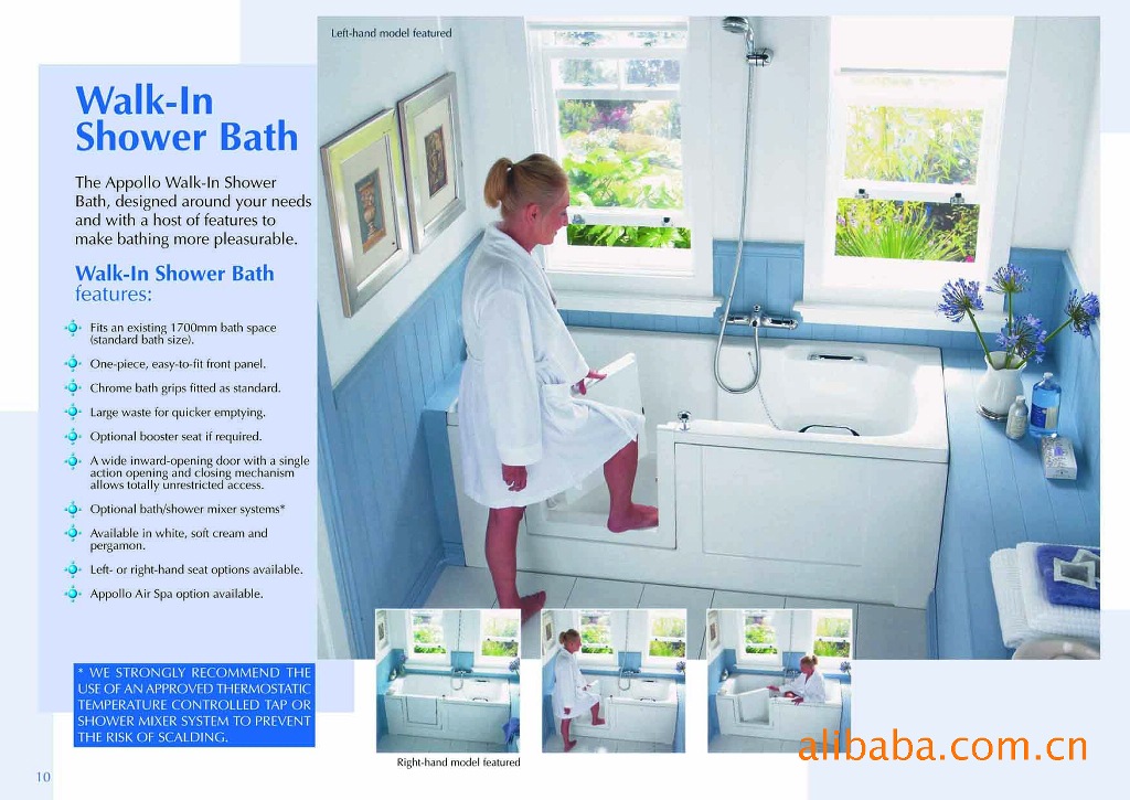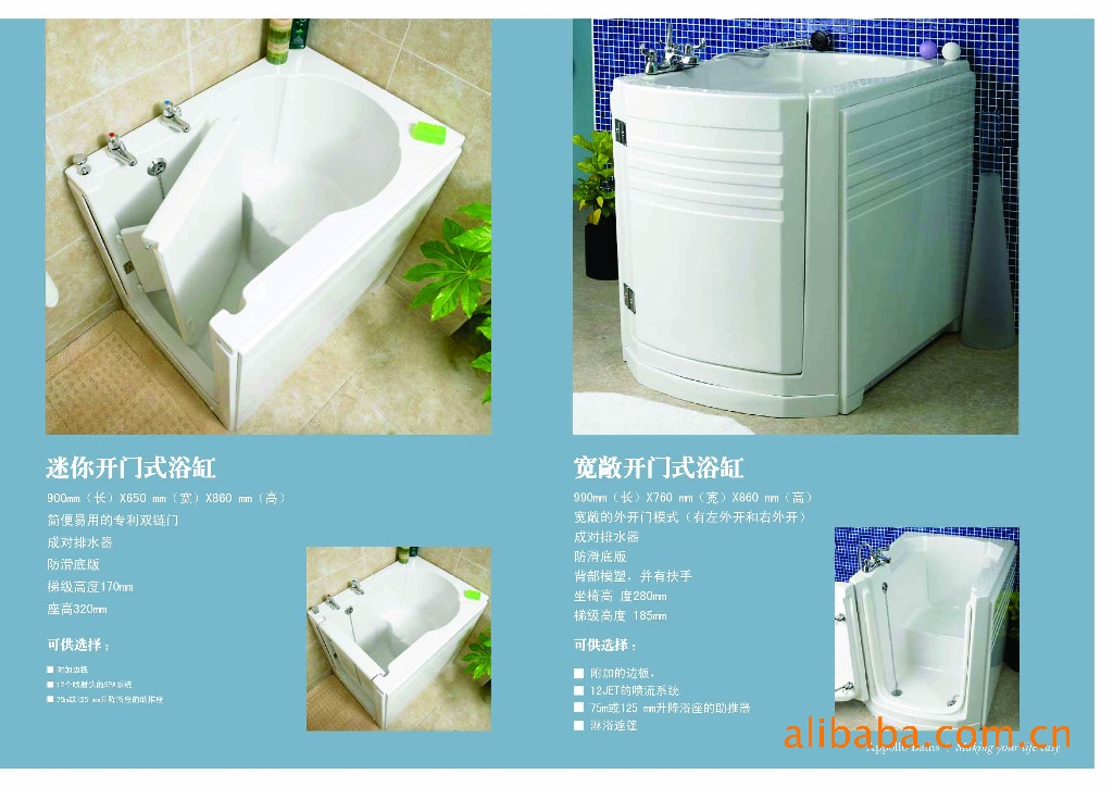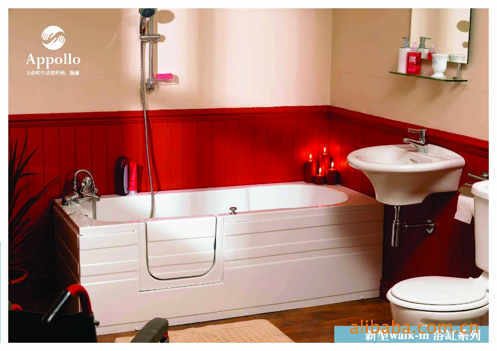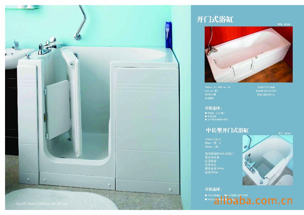 专为残疾人、老年人、行动不方便的人士设计的开门浴缸,入浴者不用抬腿,直接进去。 方便、安全 REDISCOVER Your Independence 淋浴是一种愉悦,放松的体验,每个人都乐在其中。 不幸的是,有时候对于行动不便的人群来说这种体验变得很困难。 我们这些系列产品的设计就是来帮助这些进入浴缸有困难的人们可以使用标准的浴缸。 无论你住在家里,或养老院,疗养院,或医院,,我们的产品给你一个帮助你的解决办法。 作为一家主要的浴缸生产厂家,我们的产品设计都在任何情形下自然融合。 开门式亚克力浴缸 尺寸:1700x750 *配1700mm的浴缸空间(标准浴缸尺寸)设计独特。 *同时适合淋浴和泡浴。 *一整块的易暗装正面板 *快速排水的优质排水器(可在本店购买) *宽敞的内 推门,开门简单单一,使得使用者完全自由进出。非常适合行动不便人士。 *采用优质亚克力材料 *普通出口包装。 龙头下水本店另有出售。 开门缸的特点: 工艺要求很高的密封门 切割流体静力学技术保证水密门封在多年使用中无任何损坏。 高位坐椅可以让浴者方便、舒适地沐浴 圆型座位。 可以更好更舒适地洗澡。 适用于淋浴和泡浴 洗澡的时候,坐在椅子上可同时享受淋浴和泡浴 。 方便使用的门锁 高质量门锁可以让那些锁门困难的人很轻易的锁门。这项装置适合任何人使用并且可以轻易调整。 |