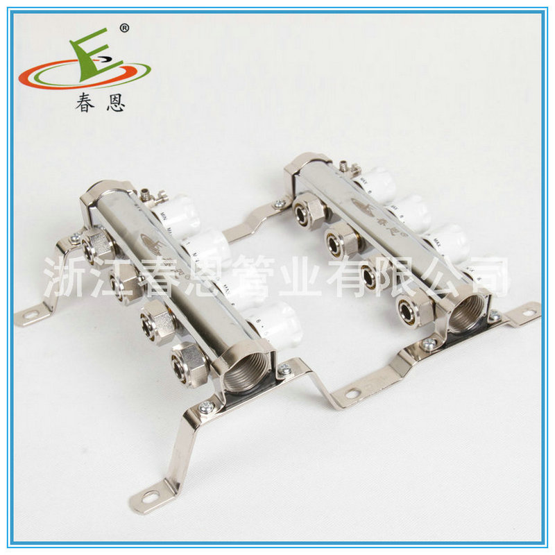 分、集水器(manifold)是水系统中,用于连接各路加热管供、回水的配、集水装置。按进回水分为分水器,集水器。所以称为分集水器或集分水器, 俗称分水器。地暖、空调系统中用的分水器材质宜为黄铜、自来水供水系统 户表改造用的分水器多为PP或PE材质。 供回水均设排气阀,很多分水器供回水还设有泄水阀。 供水前端应设“Y”型过滤器。 供水分水管各支管均应设阀门,以调节水量的大小。分水器常用于:1. 地板采暖系统中的,分集水器管理若干的支路管道,并在其上面安装有排气阀,自动恒温阀等,一般为铜质较多。口径小,多位DN25-DN40之间。进口产品较多。2. 空调水系统,或其它的工业水系统中的,同样管理若干的支路管道,分别包括回水支路和供水支路,但其较大多位DN350-DN1500不等,用钢板制作,属于压力容器类专业制造公司,其需要安装压力表温度计,自动排气阀,安全阀,放空阀等,2个容器之间需要安装压力调节阀,且需要有自动旁通管路辅助。3.自来水供水系统,分水器的使用有效的避免了自来水管理方面的漏洞,集中安装、管理水表,并且配合单管多路使用降低了管材采购成本,而且极大的降低了施工时间,提高了效率。自来水分水器通过异径直接连接于铝塑主管道,在水表池(水表房)中集中安装水表,做到一户一表,户外安装、户外查看。目前全国各地户表改造正在大范围进行中。