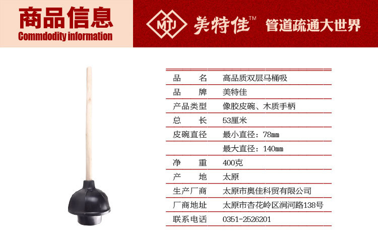 采用优质橡胶制成,全高52CM,皮碗直径14CM(购买前请确认下水道口径是否在此尺寸范围内)。手柄把握舒适,底部软皮碗密封,可压缩气囊吸力大。硬度适中,防止使用过程中上翻。可用两种方式疏通:堵塞较轻时,可直接把皮吸对准马桶口,用力按下,将堵塞物直接揣下去;堵塞严重时,使用时轻缓按下,让气体排出,然后用力向上拔,将堵塞物带出来(可根据实际情况选择合适方式)。