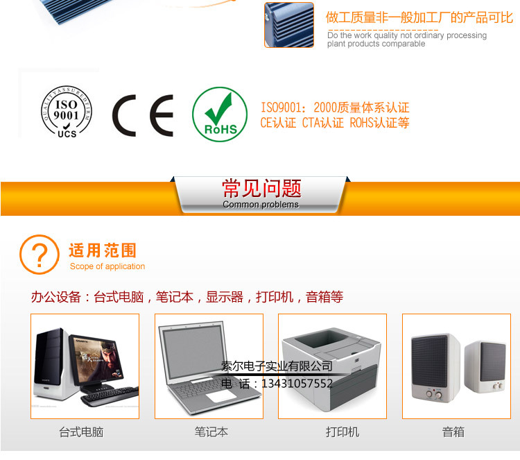 公司技术力量雄厚,产品质量过硬,成功通过了ROHS、CE、CTA及ISO9001:2000质量体系等认证,荣获中国优质品牌产品证书,已有多家进出口公司授予本公司优质供应商的称号。产品畅销国内市场并远销非洲、美洲、欧洲、东南亚及中东地区等;产品成熟,销售网路完善,在行业的知名度越来越高;产品质量得到国内外客户一致肯定,索尔品牌已经深入民心。