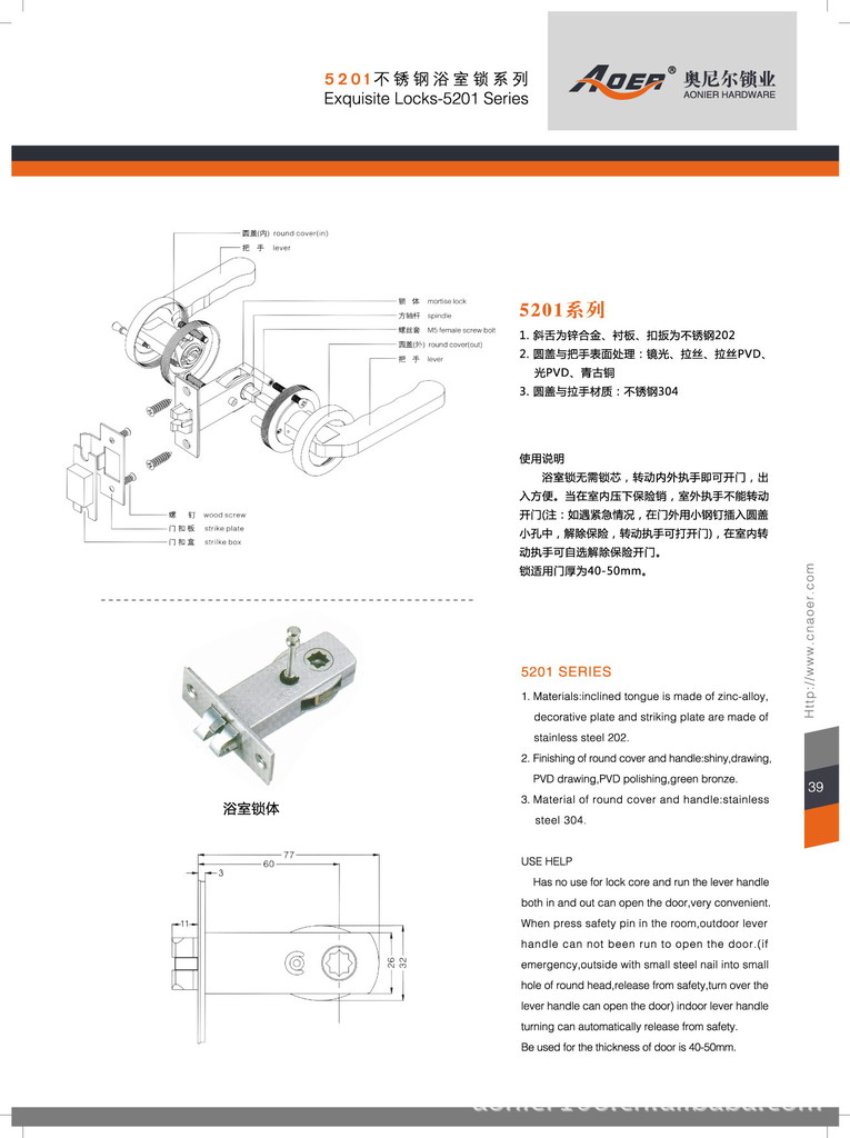 浴室锁无需锁芯,转动内外执手即可开门,出入方便,当在室内压下保险销时,室外执手不能转动开门(注:如遇紧急情况,在门外用小钢钉插入小孔中,解除保险,转动执手可打开房门)在室内转动执手可制动解除保险销开门。