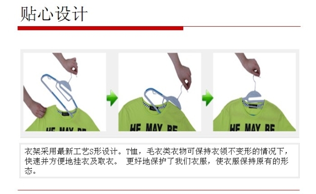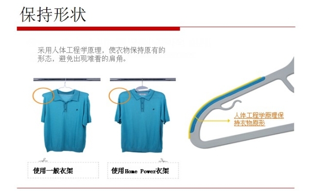 2.衣架顶端独特的S型设计,可有效保护衣领不会拉大变形。