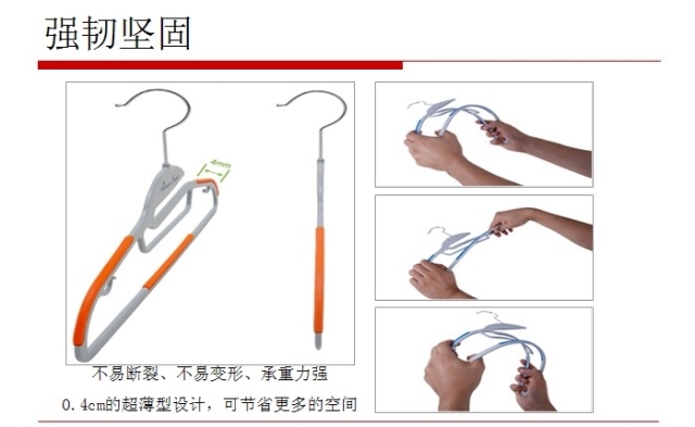 1.节省空间:魔术衣架厚度只有0.5CM 非常的薄,虽然很薄但很坚固,可以承载15公斤重量. 2.防滑防落:它的材质是ABS改性料,外面是TPE天然合成橡胶处理的,就是这层橡胶像魔术师的手一样有一种无形的力量抓住衣服使衣服不滑落,不变形.