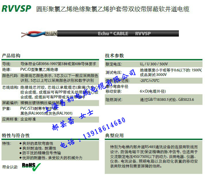RVVSP 圆形聚氯乙烯绝缘聚氯乙烯护套带双绞带屏蔽软井道电缆