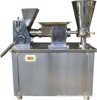 按照饺子的成形特点,采用双控双向同步定量供料原理,生产时不需另制面带,只需将面团与馅料放入指定入口,开机即可自动生产出饺子。