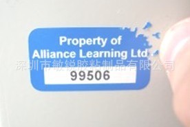 Print destructive labels,brittle labels,destructive self adhesive labels.Provide printing destructive labels service.We are professional in the field of destructive label papers,we produce the materials by ourselves,we can promise you the quanlity and the supply ability,either the destructive label materials or the destructive labels.