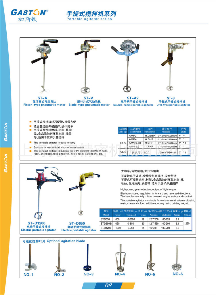 The portable agitator is suitable for work on small volume of paint, resin, chemicals, food additives, epoxy resin, printing ink, etc.