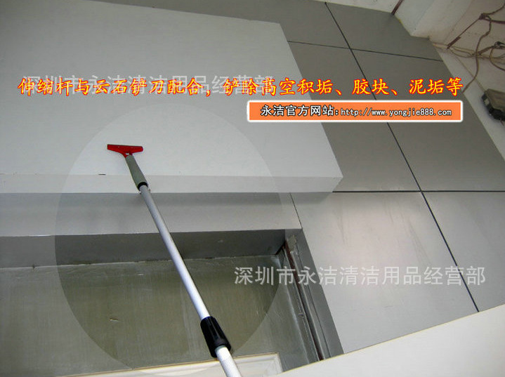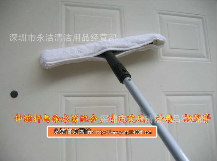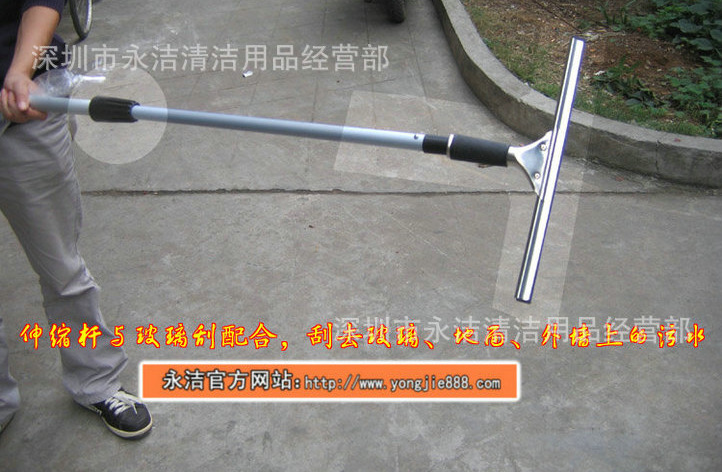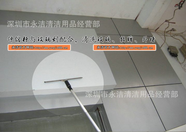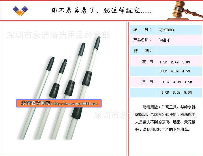 伸缩杆,采用高级铝材制成的可伸缩空心圆柱体杆,可以自由伸缩,伸缩杆尖头可以和玻璃刮、涂水器、云石铲刀、老虎夹、圆形尘埃刷、管道刷等工具配套,可以轻松地清洁高空中的玻璃、招牌,打扫扬尘及蜘蛛网,伸缩杆规格有1.2米/2.4米/3.6米/4.5米/6米/8米/9米等,还有分别制成单节杆、双节杆、三节杆,是清洁公司、物业公司的清洁好帮手。
