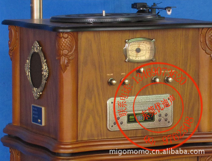 功能介绍: 型号:YM-208K 类型:立体组合式古典音响 01、三种转速留声机机芯 兼容33.-1;3/45/78转速黑胶唱片 自动/手动回臂功能 02、FM调频/AM调幅立体声收音机 旋转式AM/ FM调谐器 03、三洋(SANYO)防震CD机芯/解码芯片 兼容18/25/30厘米光盘 04、USB/SD接口播放MP3 05、CD&MP3随机/重复/自定义播放 06、CD&MP3三位数码管显示 07、双声道中音全频喇叭 08、无干扰逐级藕合电路、超静音 09、佳讯品牌高低音分频 10、独立高低音调节旋钮 11、旋转式音量控制开关 12、古青铜花纹大喇叭 13、电路过载保护电路 14、输出功率 200W 15、四面柱纯手工雕花 喇叭:505*505*540mm 主机:510*450*360mm 书柜:510*450*600mm
