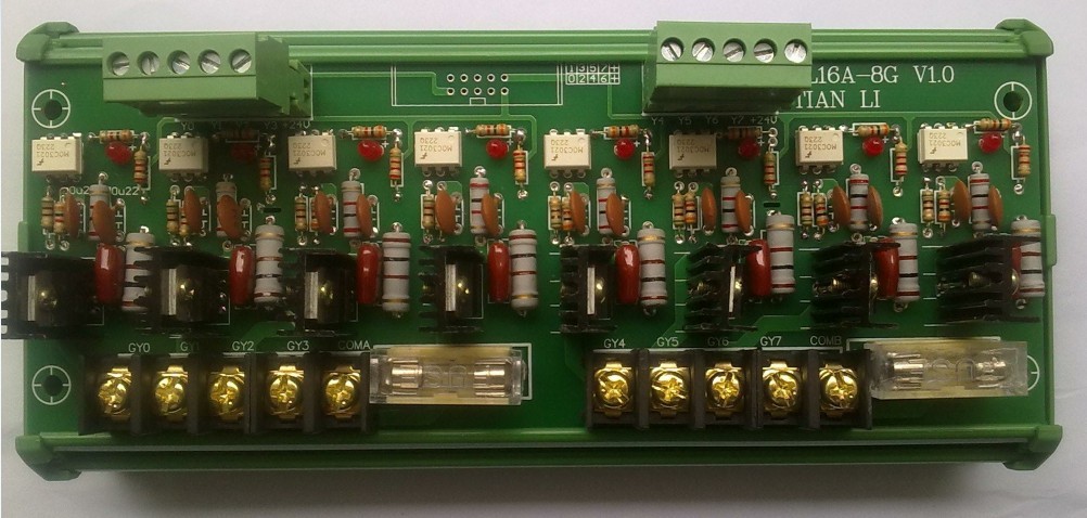 8路可控硅输出,最大交流220V、15A;每4路带短路保护(即保险)、过流保护功能,散热片等!