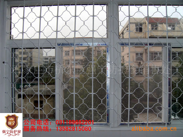 强宁高档折叠式防护窗为国家专利产品,折叠的形式为立体折叠(如同扇子的折叠方式),防护窗上下设有轨道,窗子上下端依靠销轴和尼龙轮固定在轨道内沿水平方向往复运动,带动窗子开启折叠,窗子一侧设置专用锁芯杆,内置一套完整锁机构,里侧为锁孔,可插钥匙,窗子打开靠钥匙开锁,关闭只需将锁芯杆轻轻撞击固定在用户窗框上的锁杆,使锁芯杆内的锁舌与锁杆内的锁扣相扣接,便可锁住窗户。窗子靠网状钢环的伸缩与展开来完成,钢环材质为45号冷拔钢丝,经特殊工艺处理。钢环之间用大功率电焊机实行对接焊连接,按实际安装窗户的尺寸,选用不同规格的钢环连接在数根支杆上,组成窗户整体的折叠钢环部分。该折叠式防护窗开启为10:1。窗子两侧面,设有固定侧板,一段侧板可装置锁扣,用来与锁芯板的锁舌扣接,另一端侧板与用户侧墙联接(使用紧固件),这一端侧板外还设置 一个小扣板,用小扣板扣置在侧板的端口,用拉铆钉在三个面上铆接。此种形式的防护窗既能满足用户防盗要求,又能满足用户避险逃生需求。