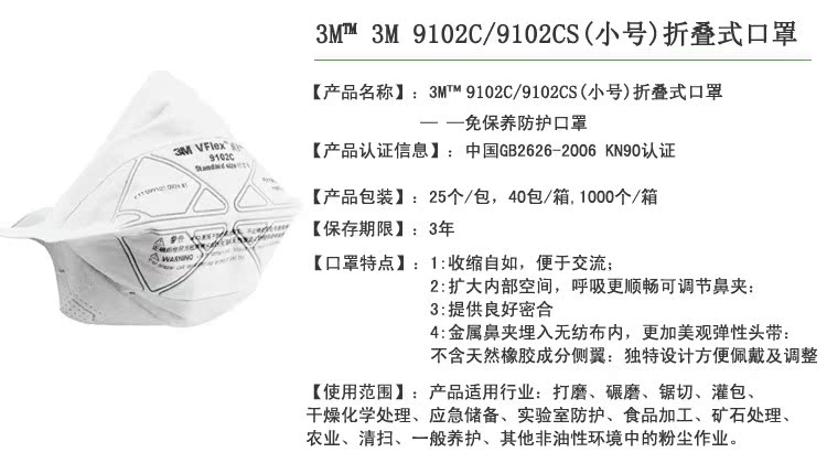 产品名称:3M 威护KN90 9102C 折叠式防尘口罩(头戴式)
