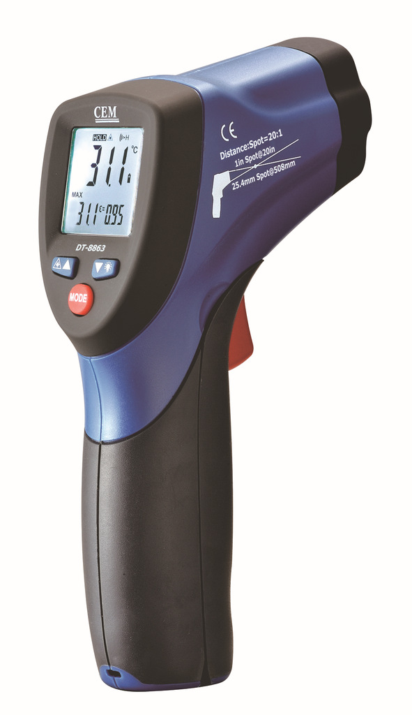 欢迎选购本公司红外测温仪。DT-8863是一种专业型的手持式非接触红外线测温仪,有使用简易,设计坚实,测量准确度高,测温量程范围宽等特点。它具有激光瞄准,带背光源显示器,最大值,最小值,平均值,差值,数据保持,高低温报警,发射率可调及自动关机功能。