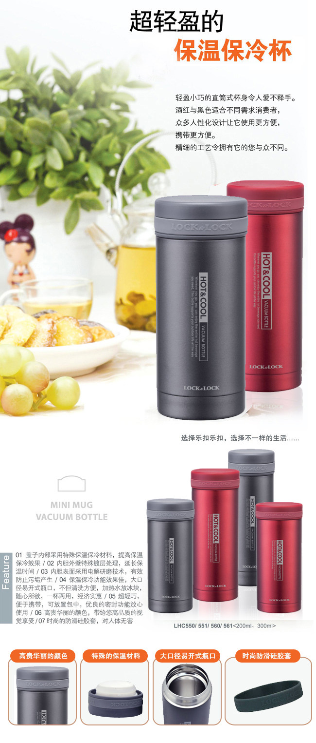 | | 货号 | 容量 | 数量 | 用途 | 规格 | LHC550 | 200ml | 1个 | - 广口的设计,易于清洗 - 304不锈钢内胆,卫生安全 - 高贵华丽的颜色,特殊保温保冷材料,时尚的防滑硅胶 | 直径60*141mm |