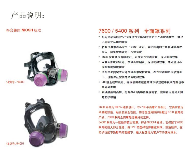 7600系列全面罩的双层硅胶密封边缘使面罩能最好地贴合面部。提供了最好的舒适性和防护。口鼻罩可以减少结雾。带硬质涂层的聚碳酸酯面屏提供200°视角;面屏光学性能好,防刮擦,符合ANSI关于防冲击和渗透的标准。传声设备使交谈方便。7600系列全面罩建立了全面罩的防护标准。
