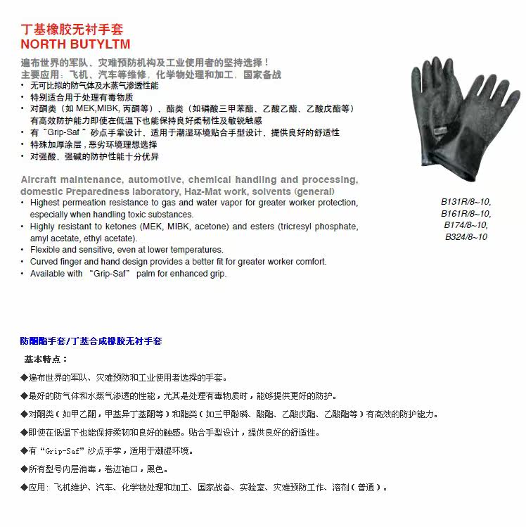 丁基橡胶无衬手套,光滑表面(厚度0.80毫米) B324