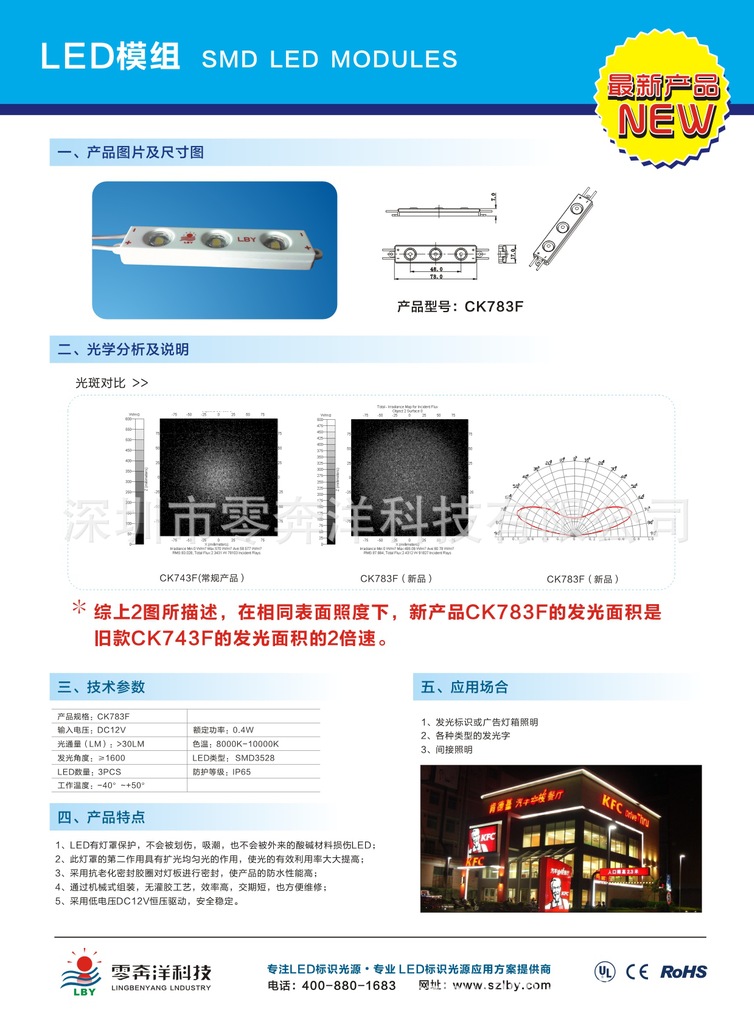 零奔洋专利产品3528三灯高亮防水模组,CK783F-7W,质保两年