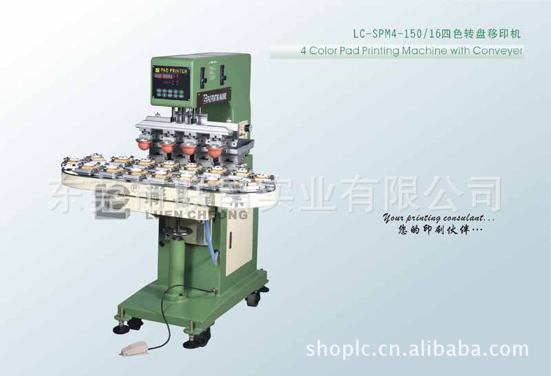 四色转盘移印机配置有16-18个工位的输送带式转盘移印机,在四色印刷过程中无需等印刷工位复位才放置产品,一直无间断式高速印刷,生产效率显著提高,非常适合订单量大的多色套印。该机设计有可抬头功能方便更换油墨、清洗油盘,方便维护。