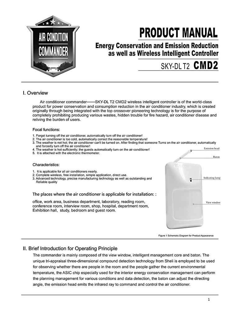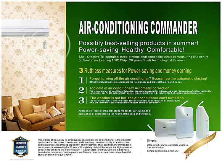 Air conditioner commander--- SKY-DL T2 CMD2 wireless intelligent controller is of the world-class product for power conservation and consumption reduction in the air conditioner industry, which is created originally through being integrated with the top crossover pioneering technology is for the purpose of completely prohibiting producing various wastes, hidden trouble for fire hazard, air conditioner disease and reliving the burden of users.