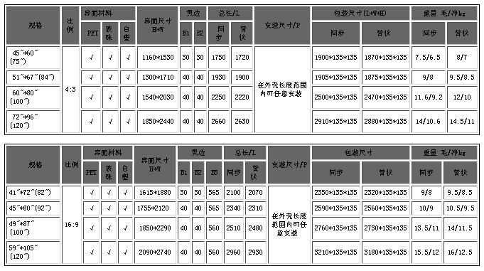 注:遥控电动幕100英寸以下加150元/个,120英寸以上每英寸加1元。
